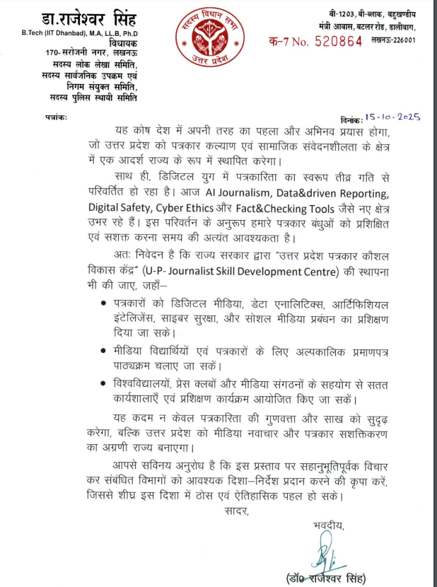 डॉ. सिंह ने पत्र में यह भी उल्लेख किया कि डिजिटल युग में पत्रकारिता का स्वरूप तेजी से बदल रहा है। आज al journalism, data driven reporting.digital safety, cyber ethics और fact checking जैसे नए क्षेत्रों में दक्षता आवश्यक है। उन्होंने प्रस्ताव दिया कि राज्य सरकार द्वारा उत्तर प्रदेश पत्रकार कौशल विकास केंद्र (up journalist skill development centre) , की स्थापना की जाये जहां पत्रकारों को निम्न विषयों में प्रशिक्षण दिया जा सके –