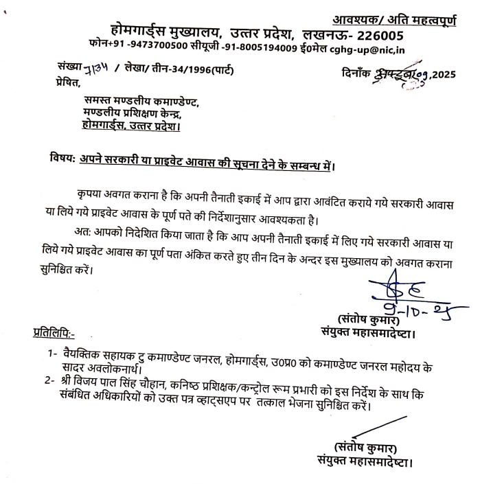 मुख्यालय पर तैनात आईजी,होमगार्ड संतोष कुमार ने पत्र जारी किया जिसमें सभी मंडलीय कमांडेंट,मंडलीय प्रशिक्षण केन्द्र को निर्देशित किया गया है कि तीनों के अंदर अपनी इकाई में आपलोगों ने जो सरकारी आवास या प्राइवेट आवास ले रखा है,पूरा पता के साथ भेजने का कष्टï करें। सवाल उठता है कि क्या विभाग में केवल डीटीसी के मंडलीय कमांडेंट ही अपने तैनाती स्थल पर नहीं रहते हैं ? आजमगढ़, अयोध्या, बरेली, झांसी, आगरा, कानपुर डीटीसी के मंडलीय कमांडेंट तो पाक्षिक दौरा करते हैं और हिसाब करके वापस हो लेते हैं। यदि सही -सही देखा जाये तो मंडलीय कमांडेंट, डीटीसी वाराणसी, गोरखपुर, मुरादाबाद, मेरठ को छोड़कर अन्य कोई भी अपने तैनाती के स्थान पर नहीं रहता है। लखनऊ डीटीसी पर तैनात ए. के. पाण्डेय भी यदि लखनऊ के स्थान पर अन्य जगहों पर तैनात होते तो न मिलते। इस तरह से 20-25 ऐसे जिला कमांडेंट भी मिल जायेंगे जो अपने तैनाती स्थल पर नहीं रहते हैं और लखनऊ में बने रहते हैं।